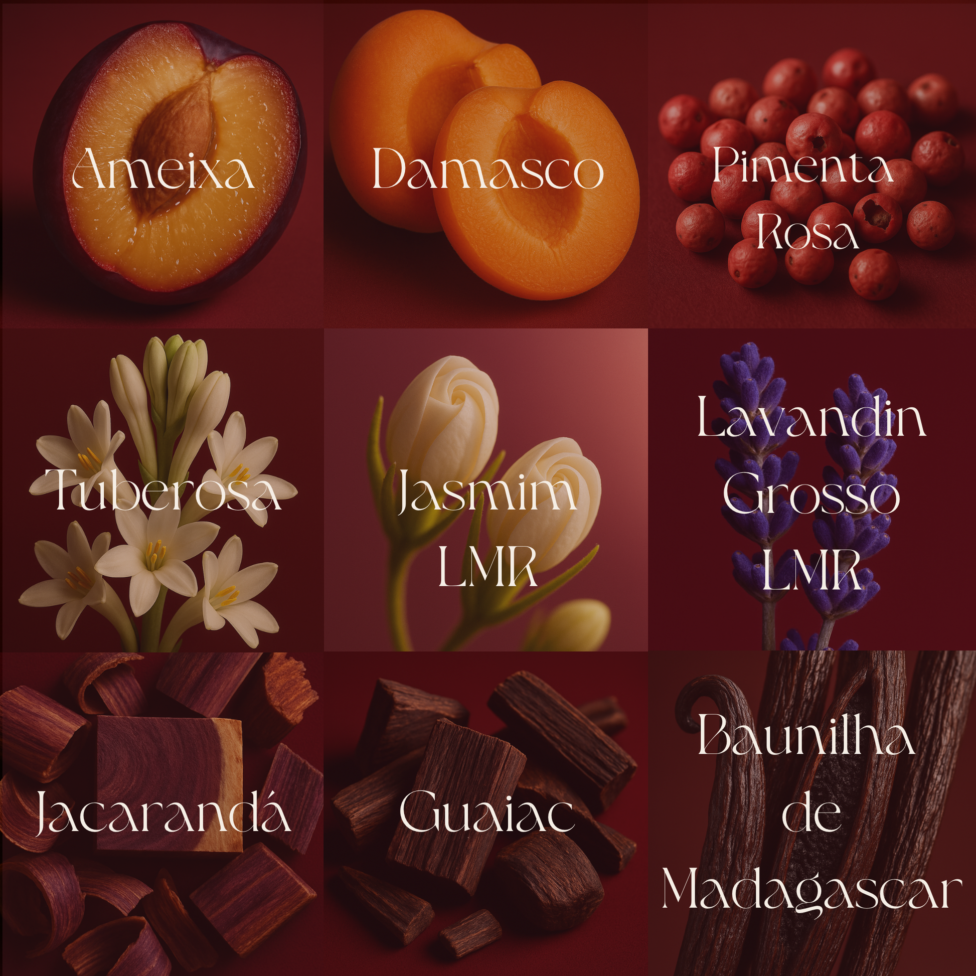 Fundo: Jacarandá, Musk, Baunilha de Madagascar, Guaiac e Madeiras Brancas.